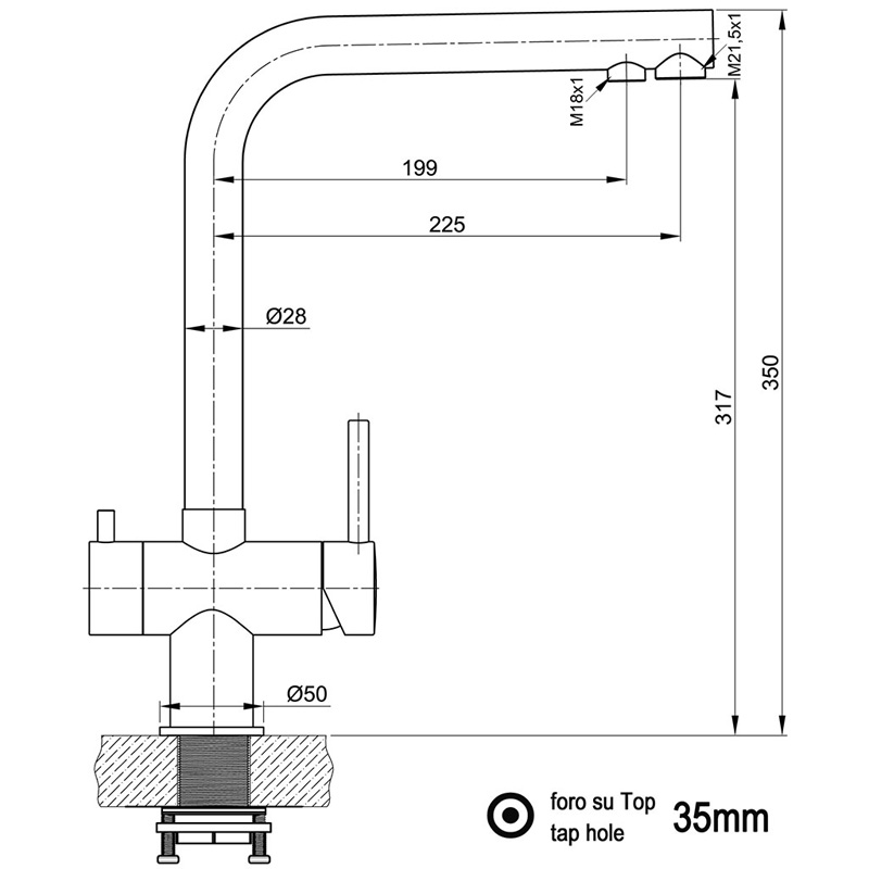 | Maße | Höhe gesamt: ca. 350 mm, Ausladung: ca. 225 mm, Auslaufhöhe über Arbeitsplatte: ca. 317 mm, Maximale Stärke der Arbeitsplatte: 45 mm |