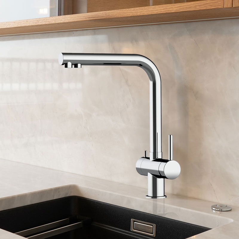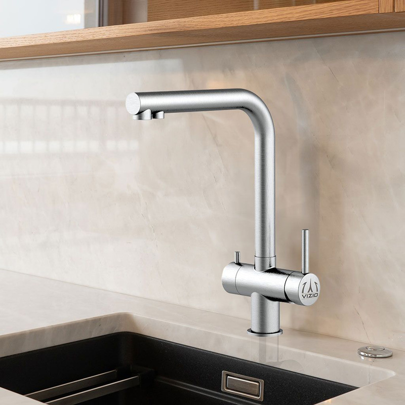 Diese 3-Wege-Armatur bietet dir gefiltertes Trinkwasser, sowie Warm- und Kaltwasser aus nur einem Hahn. Damit ist alles sauber getrennt und einfach bedienbar. Der große Mischhebel steuert das Brauchwasser, während der kleinere Hebel das gefilterte Wasser freigibt.
