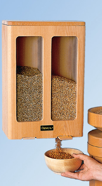 Der Getreidespeicher von Hawos mit 2 Kammern wurde aus massiver, gedämpfter Buche geschreinert und passt in jede Küchennische. Die Holzoberfläche wurde mit natürlichen Pflanzenölen veredelt.