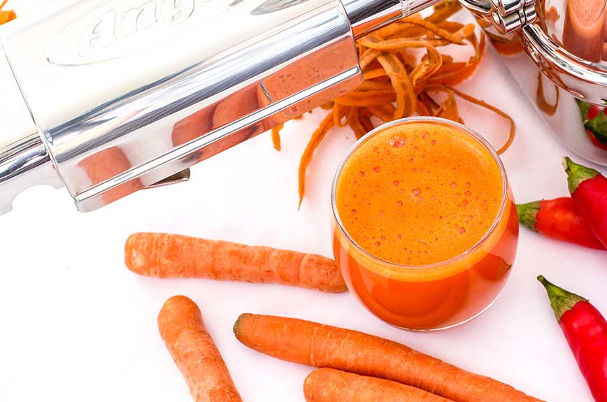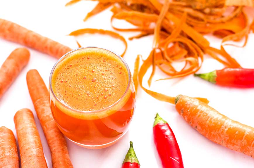 Chilischote und Karotte sind zwei Zutaten, die sehr gut miteinander harmonieren. Die Schärfe der Chilischote bringt nicht nur Deinen Stoffwechsel in Schwung sondern bremst auch Deinen Appetit. Besonders Heißhunger auf Süßes oder Salziges kann damit gut eingedämmt werden. Wird also der Karottensaft mit Chili versetzt, ist der Saft das perfekte Getränk, um erfolgreich überschüssige Pfunde abzubauen. Denn ähnlich wie Selleriesaft zeichnet sich auch der Karottensaft durch wenig Kalorien aus obwohl er relativ süß schmeckt.