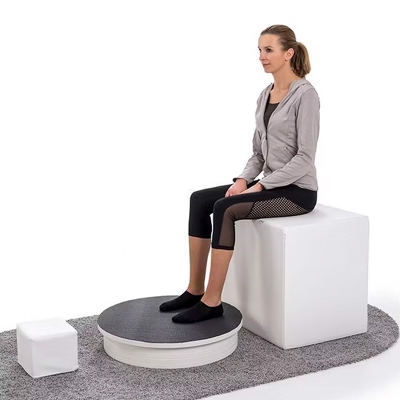 Die runde Plattform mit einem Durchmesser von 70 cm und einer niedrigen Bauhöhe von nur 15 cm sorgt für ein stabiles und sicheres Standgefühl, selbst bei eingeschränkter Beweglichkeit. Ein innenliegendes Dämpfungssystem schützt empfindliche Körperregionen wie die Halswirbelsäule und sorgt für ein besonders sanftes An- und Abschwingen, das den Körper nicht irritiert. Die Frequenz bleibt dank automatischer Geschwindigkeitsanpassung selbst bei unterschiedlichem Körpergewicht konstant.