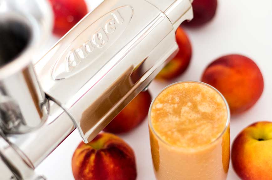 Die Herstellung von Pfirsichsaft ist mit dem Entsafter besonders einfach und effizient. Entsafter ist aber nicht gleich Entsafter! Nur sogenannte Slow Juicer entsaften Obst, Gemüse oder Gräser absolut schonend und ohne nennenswerte Wärmebildung. Das ist die Voraussetzung, damit wichtige Nährstoffe wie Vitamine und Mineralien erhalten bleiben. Deshalb raten wir auch von Dampfentsaftern oder welchen mit Zentrifugen grundsätzlich ab. Bei diesen entsteht beim Entsaftungsprozess einfach eine zu große Hitze.